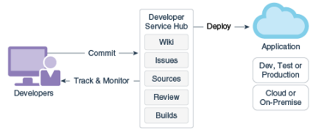 Oracle Developer Cloud Service is a collection of similar software and services hosted on Oracle Cloud. Oracle Developer Cloud Service helps you to manage the application development life cycle effectively through integration with Hudson, Git, Maven, issues, and wikis. Using Oracle Developer Cloud Service, you can commit your application source code to the Git repository on the Oracle Cloud, track assigned issues and defects online, share information using wiki pages, peer review the source code, and monitor project builds. After successful testing, you can deploy the project to Oracle Java Cloud Service – SaaS Extension, publicly available Oracle Java Cloud Service instances, Oracle Application Container Cloud Service instances, or to an on-premise production environment.