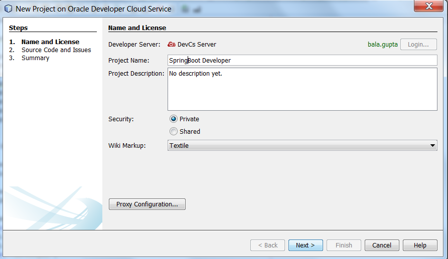 After making connection to DevCs, create new project in Developer Cloud service or open project , if project exist in DevCs.